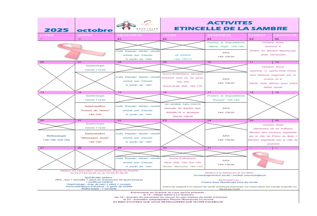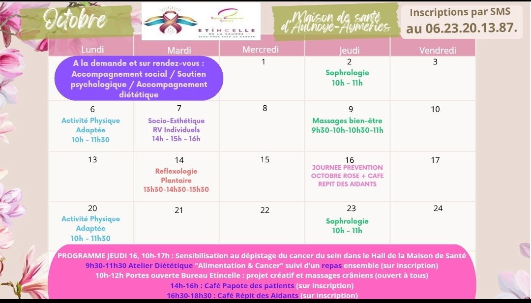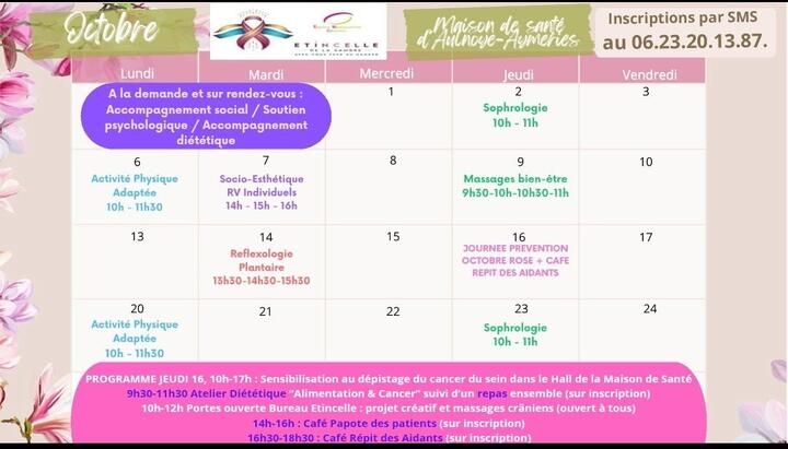 Voici le planning de nos ateliers pour le mois d'octobre ainsi que celui de nos soins de support à la maison de santé d'Aulnoye-Aymeries.