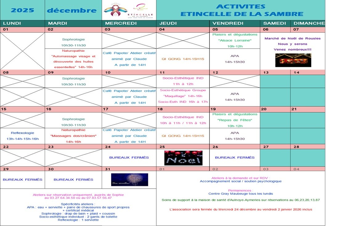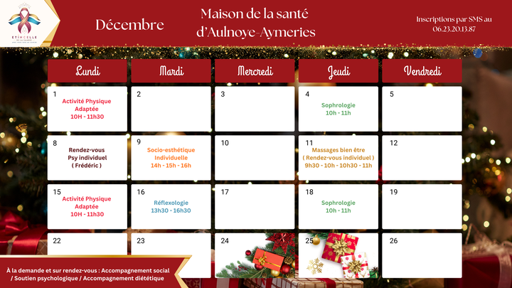 Voici le planning de nos ateliers pour le mois de décembre ainsi que celui de nos soins de support à la maison de santé d'Aulnoye-Aymeries.